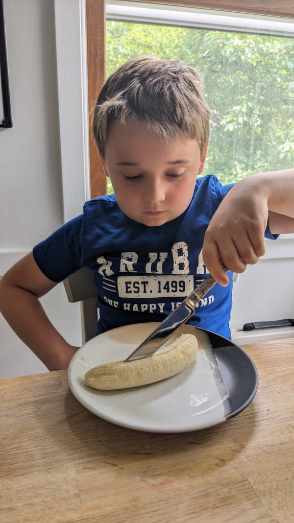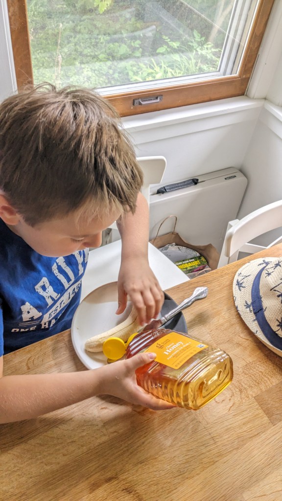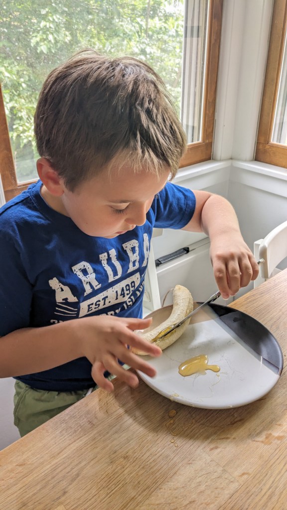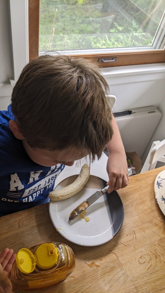 So you take a banana and you cut a little slit in it with a knife. Make sure the knife doesn’t go through the entire banana because we just want it to go through one side. make sure it doesn’t go on the end. Make sure it doesn’t cut through the edges, because then it’s going to be, like, completely split. So we don’t want that. We just might cut through the middle. Then on the knife that used to cut the banana, put honey on that knife. Take the knife with honey on it & put it through the crack in the banana. And, spread the honey around, and then you can eat it.